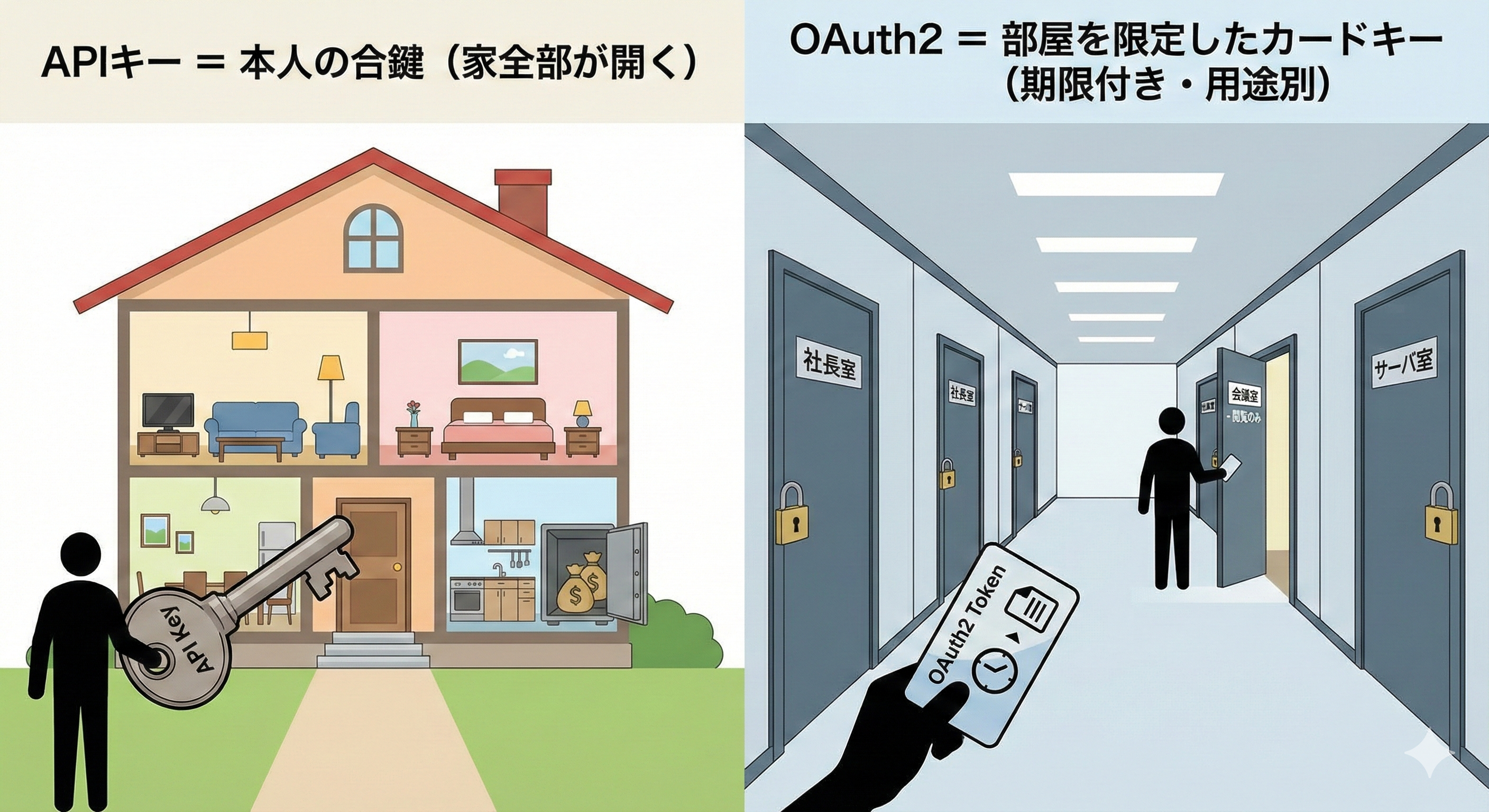 APIキーは手軽ですが、運用次第で “強すぎる権限” を外部に渡すことになりがちです。